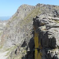 Une fois sorti de ce couloir, la pente se fait presque ridicule jusqu’au sommet qui nous tend les bras sur la droite. On longe la crête qui nous dévoile des parois vertigineuses et un panorama époustouflant sur les Encantats. Le second pic de Bassiero, un peu plus haut que le nôtre, est à un jet de pierre, défendu par une faille de 50m peu tentante. On aperçoit un gros cairn à son sommet.