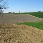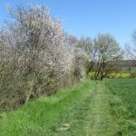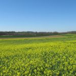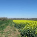 Pour l’heure, le sentier nous promène en crête et les vues sont jolies sur la vallée. Les champs cultivés ou labourés donnent parfois à cette randonnée des airs de Pays Basque. Il fait un temps quasi estival bien que le vent soit encore un peu frais et le colza a commencé à jaunir, c’est très bucolique. Nous atteignons bientôt le superbe bois de Courtiès que nous traversons. A sa sortie, nous suivons une petite route qui dessert un champ de blé qu’il faut traverser, même si le paysan a semé sur le chemin.