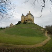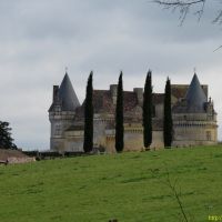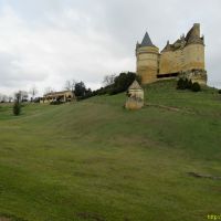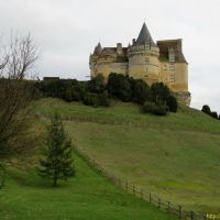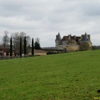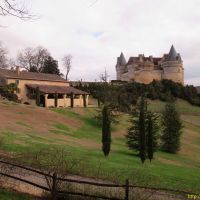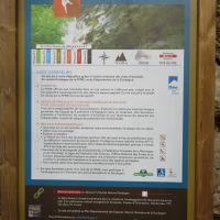 Nous descendons la route en direction de la Couze, un affluent de la Dordogne qui coule un peu plus au nord. Nous prenons une piste à droite un peu avant le pont, au-dessus du ruisseau. Ce chemin large bien balisé, remonte la Couze jusqu’au château de Bannes. Il n’est pas besoin d’atteindre le château mais il serait dommage de ne pas lui rendre une visite de courtoisie, il est très joli, planté sur son promontoire.