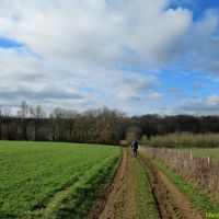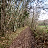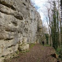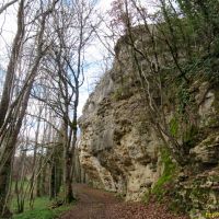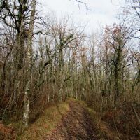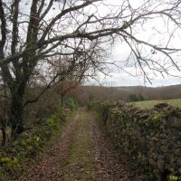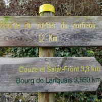 A la bifurcation nous continuons vers Larroque où nous abandonnons la route, pour prendre en face un chemin creux, au bout duquel nous traversons un petite route, pour continuer en face et rejoindre le chemin du Beaumontois, un bon sentier de pays. Nous descendons en direction du Rocher du Corbeau, un site d’escalade proposant plusieurs voies intéressantes, le long d’un sentier qui nous ramène à la toute première intersection, par la piste que nous avions ignorée ce matin.