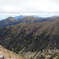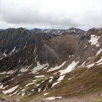La crête peut se gravir intégralement depuis là, avec des portions plus ou moins aériennes. Avec le vent fort, il vaut mieux continuer le sentier qui passe à droite en contrebas de la crête à l’abri des bourrasques et permet d’éviter la plupart des difficultés. Ce sentier en dévers dans la rocaille est très beau et plus montagnard, il nous permet d’admirer la Tour d’Eyne, le Pic d’Eyne et au fur et à mesure que nous nous élevons, le Puigmal de Segre et le Puigmal d’Err. Le Pic de la Fossa, le Geant, le Redoun, et au loin le Canigou, sont aussi là