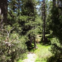 Nous pique-niquons à ce sommet cairné et plongeons en direction de Saint Pierre Dels Forcats, guidés par quelques cairns faciles à suivre. Là aussi la pente est raide mais le cheminement facile et évident. Après avoir dénivelé un gros éboulis puis un moyen et enfin un plus fin, nous rejoignons la forêt où le sentier est toujours bien tracé.