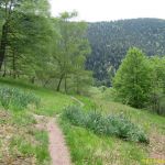 A l’entrée du hameau nous prenons une rampe goudronnée, à droite, qui s’élève au-dessus de la route et rejoint le beau et large chemin parfois empierré, qui passe au-dessus d’une maison, puis s’enfile dans une splendide vallée. Un arboretum a été aménagé avec le nom de quelques arbres. Ce sentier dessert d’anciennes granges dont deux ou trois ont été aménagées. Nous verrons beaucoup de ruines tout le long du parcours, du moins dans la partie arborée.