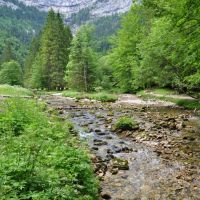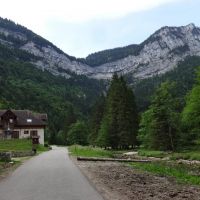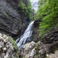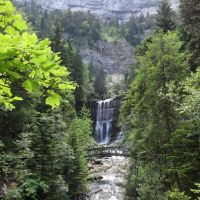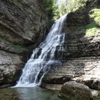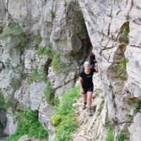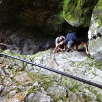 Nous avons pris le sentier qui monte rive droite. Avant d’atteindre le pont de bois qui permet de traverser le Guiers au pied de la cascade, il faut prendre, toujours rive droite, le sentier du grand tour. Il passe par la grotte que l’on atteint après un peu d’escalade le long d’un passage aménagé mais qui peut être délicat par endroits. Je pense ici aux jeunes enfants, c’est humide, faites attention qu’ils assurent bien leurs pieds.