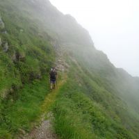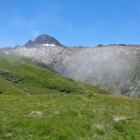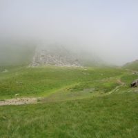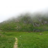 Suivez toujours les balisages jaunes qui vous font descendre vers la cabane d’Espugues. Contournez-la pour descendre vers le sentier qui arrive de l’étang de Milouga. Vous pouvez y aller moyennant un petit aller-retour, sinon, prenez à droite le sentier qui reste à peu près sur la même courbe de niveau et rejoint la cabanne-refuge du Taus. Hélas, nous n’avons pas pu profiter des vues magnifiques et du sentier à flanc de paroi, car nous étions à nouveau dans le nuage qui ne nous a plus quittés.