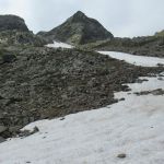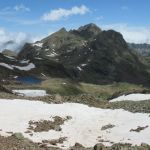 Quelques névés persistants donnent à l’endroit un cachet de haute montagne. L’étang de la Goueille 50m plus bas nous tente mais ce vent fou nous dissuade de continuer.