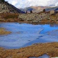 Nous arrivons en vue du premier lac et c’est l’enchantement. Il faut dire qu’il en jette avec ses eaux limpides dans lesquelles le ciel bleu se reflète. L’endroit alterne les zones herbeuses et les plaque de glace. En été c’est assez marécageux, mais là, nous avançons sans difficultés.
