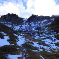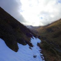 La descente vers la Coume de Varilhes est aussi en neige dure dans les lacets facés nord et il faut être prudents, car la pente est plus accentuée et l’enneigement plus important que sous le Malpas.
