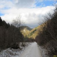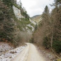 A Comus, nous traversons le hameau par le route du bas et nous nous garons devant la station d’épuration où un parking est à disposition des randonneurs. Nous continuons cette large piste encore gelée à cette heure matinale, surtout qu’elle est dans l’ombre le matin. C’est très beau ce paysage givré avec la belle matinée qui s’annonce. La tempête de décembre a laissé des traces avec des traces de laisse et des arbres couchés le long des gorges.