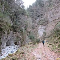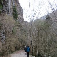 Dès lors, le cheminement est très beau avec des falaises de plusieurs dizaines de mètres de haut, du fond desquelles le ciel est à peine visible. Le ruisseau de l’Hers, encore en crue il y a quelques jours, est totalement à sec. Son lit d’une blancheur étonnante borde le sentier et la trace d’une cascade assez haute est visible à mi-parcours. A partir de cette cascade, le sentier descend et traverse le ruisseau toujours à sec, peu avant l’arrivée au parking.