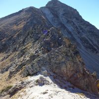 Après être montée faire des photos sur la crête croulante d’un blanc immaculé, je décide de laisser mon sac à la Hourquette où m’attend mon binôme, pour revenir en arrière. Je gagne un petit col sans nom et file en direction de la pente un peu raide, mais sur terrain stable (que l’on prend en ski de rando), d’où je rejoins le sentier qui arrive de la brèche.