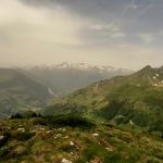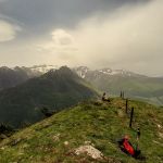 A un genre de petit col, avant que le sentier ne descende par le bois du Lis, nous bifurquons à droite toutes pour monter au point 2027m, mamelon sans nom, qui offre des vues magnifiques sur Gavarnie (aujourd’hui derrière une nuée orageuse), derrière nous sur la secrète Montagne des Troucouets et surtout sur la crête du Soum Arrouy, Soum de Lascours, Pène Dets Pourri qui nous cache le superbe Lac Bleu de Lesponne.