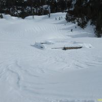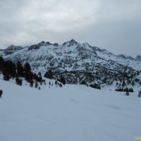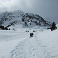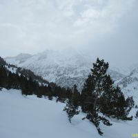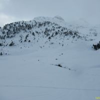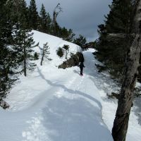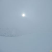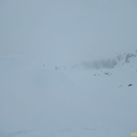 Le vent est absent du tableau, en revanche, nous essuyons effectivement quelques averses de neige après le Pé deth Malh. Le brouillard devient plus épais et nous devons nous arrêter régulièrement pour faire le point avec le gps, surtout après le carrefour des sentiers. La trace est inexistante depuis le départ et la neige plutôt molle et collante ne facilite pas la progression.