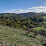 La liaison entre les deux collines est assez aléatoire si on ne veut pas trop redescendre. A une intersection, nous délaissons les deux panneaux indicatifs pour traverser des prés à gauche par une piste herbeuse et rejoindre une autre piste visible sur la carte. Une chance, nous découvrons un petit portillon qui nous évite de traverser une zone fermée par les ronces en bout de champ.