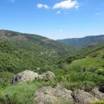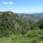 Nous partons du village de Sablières, enfin disons plutôt du parking du camping au bord de la Drobie au hameau de Chambon. Vous l’atteindrez en suivant la D220 direction Le Chambon. Du parking nous revenons sur nos pas par la route jusqu’au Chambon. Là, le balisage est sur notre droite, il monte entre des maisons ruinées.