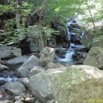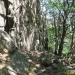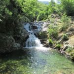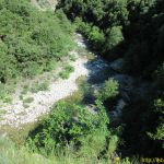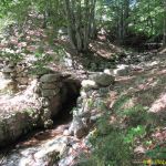 Arrivés à la Fouette, au bord de la route, nous trouvons le GR4 qui descend un peu à gauche avant de traverser la D4 plus bas. C’est le tracé classique qui passe par la crête en face et le hameau de Petit Paris. Pour notre part, nous décidons après avoir déjeuné à La Fouette, de prendre la large piste à droite qui monte en crête et flirte plusieurs fois avec la D4 jusqu’à retrouver le GR4. Nous prenons à droite et traversons alors une source par une gué pour rejoindre peu après le sentier de descente qui va longer la Drobie par sa rive gauche, sur un superbe chemin taillé dans la roche.