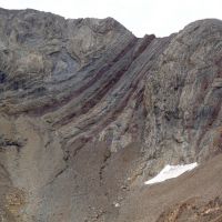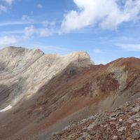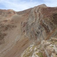Nous attaquons bientôt la montée par le Canal Fonda que l’on remonte jusqu’au col del Diente que surplombe la magnifique Diente de Llardana. Ce couloir est en éboulis croulant et nécessite les crampons s’il est encombré par la neige. Sinon, on longe les névés résiduels sous la paroi de la Diente de Llardana. La première partie jusqu’à la combe au pied de la Tuca Alta monte raisonnablement, la pente finale en revanche est assez soutenue. En arrivant au col, la vue sur las Espadas et ses drapés de roches colorées est époustouflante.