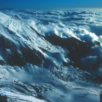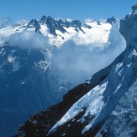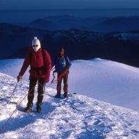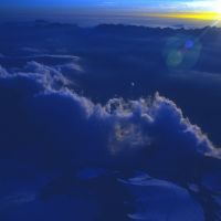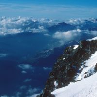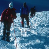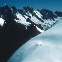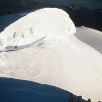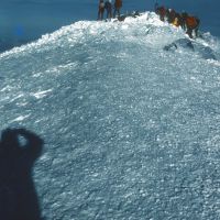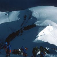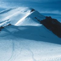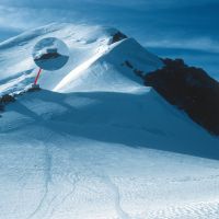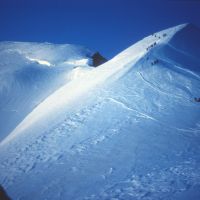 Il faut dire que j’avais fait le Mont Blanc l’année précédente, en juillet 1986 avec un équipement de merde et je m’étais gelée presque tout le long de la montée dès la sortie du duvet, à 3h du matin et en particulier après le refuge Vallot, sur l’arête finale où le vent nous bousculait un peu. Je ne parlerai pas du sommet atteint vers 7h du mat’, d’où j’ai regardé le paysage à mes pieds d’un œil torve en grelottant. Mon seul rêve était à cet instant de redescendre me mettre à l’abri du vent ou que le soleil matinal me réchauffe enfin :-D, mais à 4810m, c’était utopique.