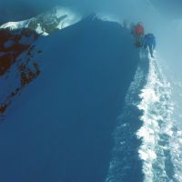 En détails : la traversée du couloir aujourd’hui appelé « couloir de la mort », maintenant équipé d’une corde fixe, se fait sans encombre car nous sommes montés le plus tôt possible, et les pierres sont encore collées au sol. En plus, il y a encore beaucoup de neige, ce qui permet un passage plus « facile », enfin disons moins dangereux.