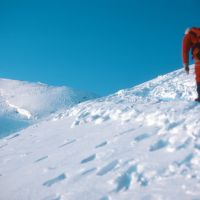 En résumé : -15°, fort vent, mauvais anorak de ski, gants de ski, knickers, chaussettes de laine avec des guêtres, des sur-chaussures, eau gelée dans les gourdes, barres de Mars tellement gelées qu’il est impossible de les casser avec les dents, cagoule qu’on m’a prêtée qui sent l’assouplissant et me donne la nausée. On ne peut pas dire que je nage dans le bonheur, mais je suis motivée « grave » et à part enguirlander mon binôme qui marche trop vite pour mon goût et tire sur la corde comme si j’étais son chien, je fais bonne figure jusqu’au bout.