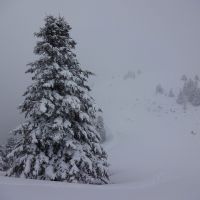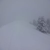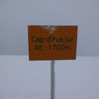 Il ne fait pas froid et il n’y a pas de vent, du coup, la randonnée est agréable. Nous prenons la piste la plus à droite selon les indications insistantes de la dame du guichet « suivez les piquets oranges » insiste-t-elle. Alors nous suivons d’abord ceux qui passent au-dessus du restaurant et mène assez rapidement au Cap d’Asour. Là, demi-tour pour rejoindre en descendant à droite le carrefour trouvé précédemment. Nous montons alors en direction d’un col et nous nous payons même le luxe de faire le cap de Nestes, tout ça dans la purée.