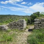 Du parking nous prenons le sentier qui démarre à droite quand on tourne le dos à la route. Nous nous dirigeons logiquement vers le plateau, donc à gauche. Au premier grand carrefour nous suivons la branche de droite et bientôt les ruines sont visibles sur notre droite en bordure du plateau.