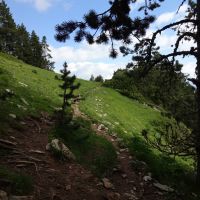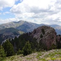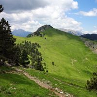 Il faut maintenant la suivre sur 3km environ, puis, dans un lacet où on trouve des panneaux, notre itinéraire grimpe dans l’herbe en face, légèrement à droite. Il passe en sous-bois et grimpe raide tout le long de la crête en direction du Roc Cremat. Après un genre de collet, la pente s’adoucit et gagne en traversée la cabane de Moixero où de nombreuses marmottes batifolent. De là, notre sentier est visible, il passe sous le Pla de Moixero en une longue traversée qui va du col de Moixero d’où les vues sur la Pedraforca et le Comabona sont grandioses, au collet Raset où on trouve un panneau indiquant la direction de Greixer.