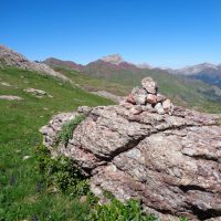 Nous nous dirigeons à bisto de nas en longeant le vallon, vers l’échancrure que nous avons en ligne de mire depuis la première bergerie. Il faut rester assez haut par rapport au ruisseau pour ne pas s’empêtrer dans les marécages. Nous atteignons le col après 2h de marche tranquille depuis la voiture.