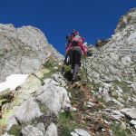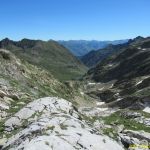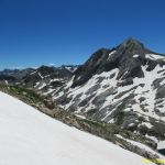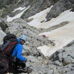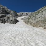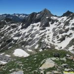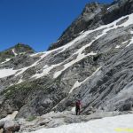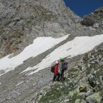 La grimpette d’hier au Tuc des Nères a laissé des traces et nous déplorons deux abandons à l’arrivée au lac. Nous continuons pour passer aux choses sérieuses, le long du ravin de Nere. On navigue entre éboulis, dalles de pierre et névés plus ou moins pentus. Le sommet s’éloigne à chacun de nos pas.