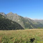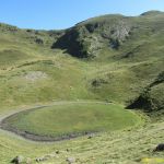Après la sortie de la forêt nous dépassons deux randonneuses puis nous rencontrons un groupe d’Espagnols qui semble arriver du Pas de Vilamos. Tous préfèrent filer tout droit après la source captée, mais nous, nous choisissons de passer par les cabanes d’Arro et l’Estanh des Garces toujours à sec.