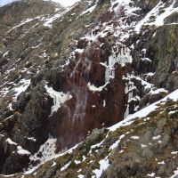Nous chaussons les raquettes à environ 1900m. La neige n’est pas très épaisse pour l’instant. Nous passons devant la cascade de Riou Nère, puis nous grimpons à gauche quelques ressauts parfois scabreux, mais sans dangers.
