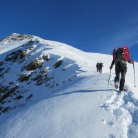 L’idée est de grimper au Pic de Port Vieux. Le sentier est facile à suivre et la neige est suffisamment portante pour éviter de chausser les raquettes. Nous mettons les crampons au pied du col, quand la neige devient plus dure et la pente plus prononcée.