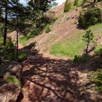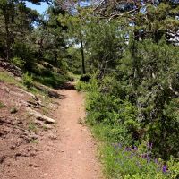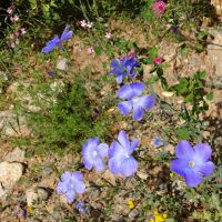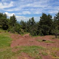 Nous passons un zone où la terre et les roches sont rouges. C’est très beau avec le ciel bleu, la prairie vert tendre et les diverses fleurs.