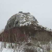 Au col il reste une petite pellicule de neige, mais nous montons sans encombres. Le château perché sur son promontoire, occupe le fond d’écran.