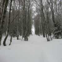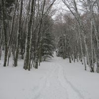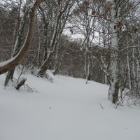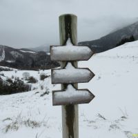 Il a neigé hier toute la journée et toute cette nuit encore, plus aucune trace ne subsiste et ce ne sont pas les panneaux qui nous ont aiguillés vers le bon tracé 😀 . Si le départ est croûté sur quelques mètres, rapidement, nous nous enfonçons jusqu’à mi-mollet 🙂