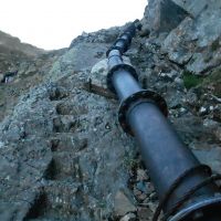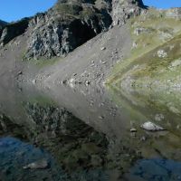 Après avoir grimpé un petit couloir qui longe un gros tuyau scellé dans la roche, on atteint le lac d’Uzious qu’on longe en montant par la gauche, on arrive rapidement au lac de Lavedan au pied du col d’Uzious.