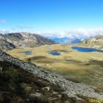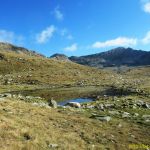 Les sentes sont nombreuses et mal tracées et se rejoignent toutes, la direction ne fait aucun doute, l’échancrure du col de Rosari est évidente. Nous retrouvons une bonne trace au pied du col. Nous laissons en contrebas à gauche les Estanys del Rosari, qui invitent à la sieste. Nous y passerons au retour.